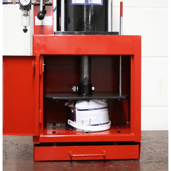 - Air operated paint can press with safety lock-out device which prevents the door being opened during operation.