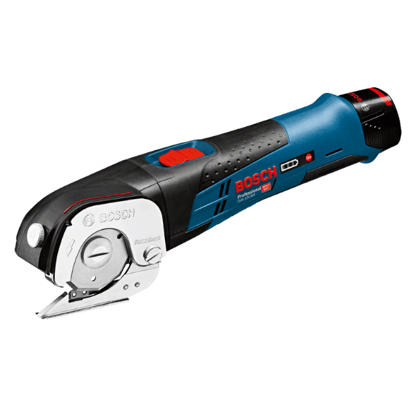 The Bosch GUS 12V-300 Professional Cordless shears are intended for cutting PVC, carpet, cardboard, leather, and fabrics, including composites. It is compatible with all Bosch Professional 12 V batteries and chargers.