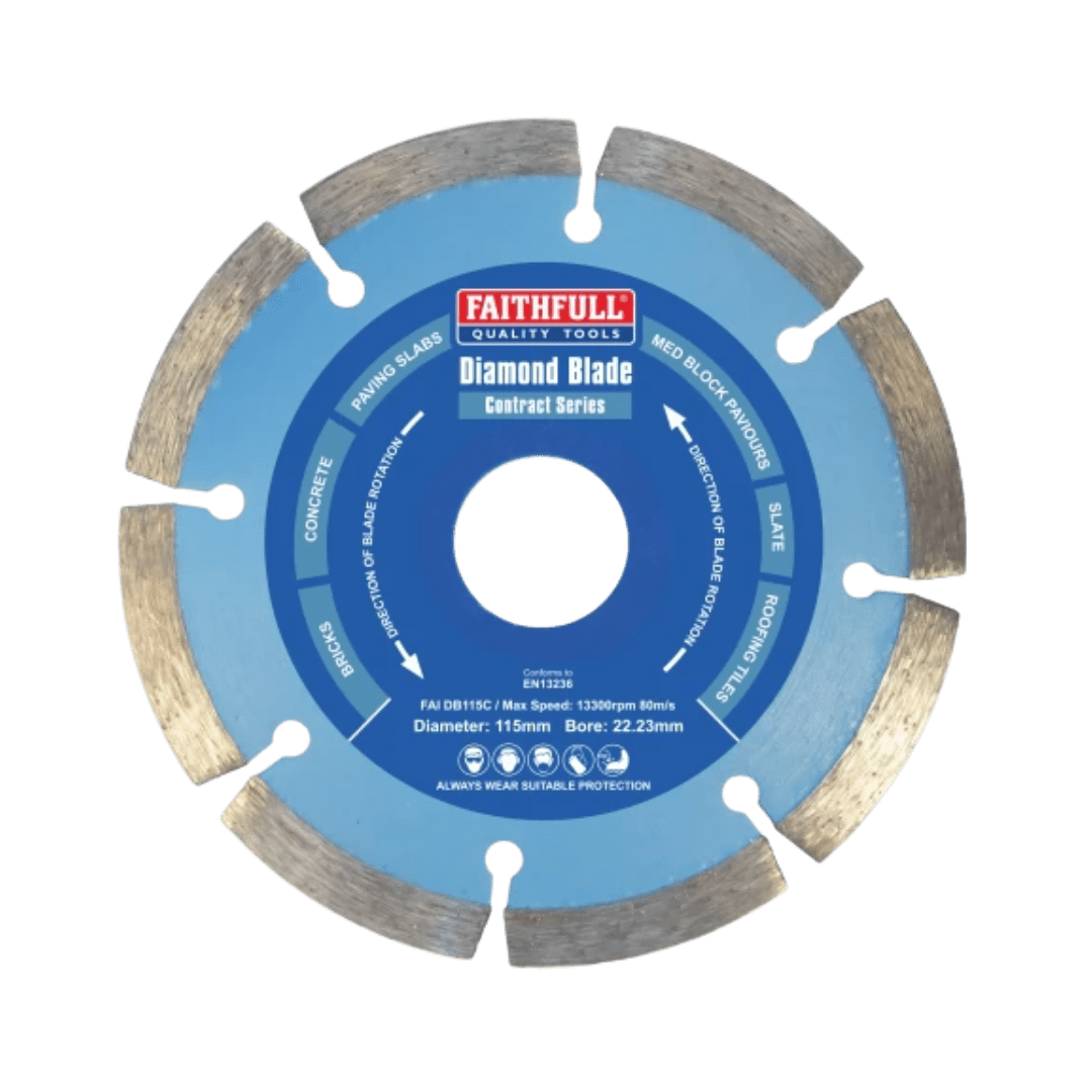 This Faithfull Contract Diamond Blade has 7mm sintered, diamond impregnated segments. Suitable for wet and dry cutting, and ideal for general cutting applications such as tiles, paving slabs, breeze blocks and brickwork.