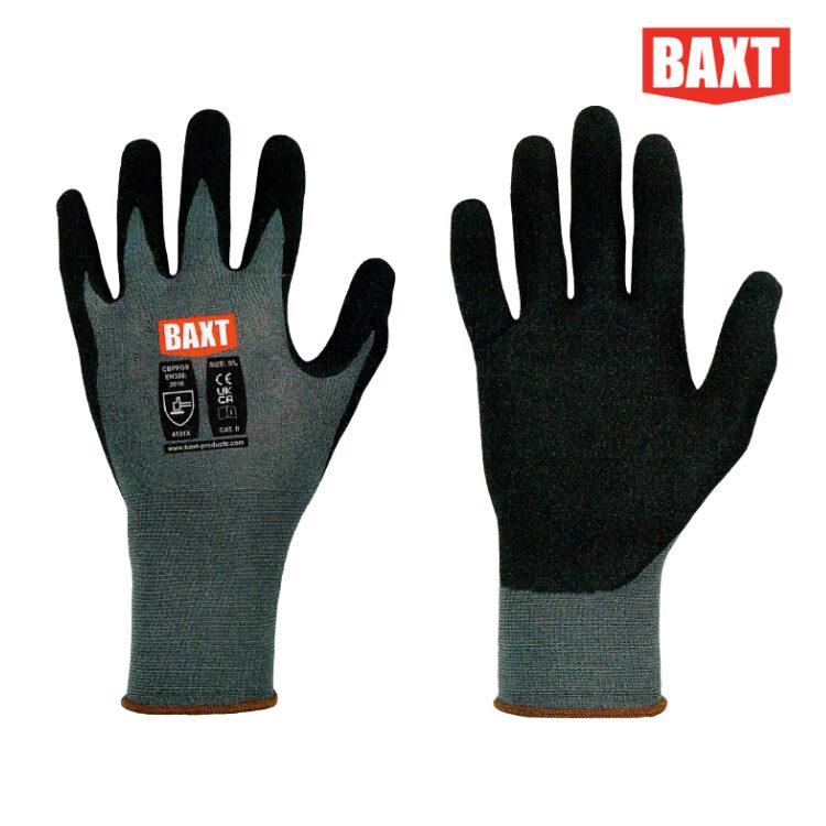 15-gauge grey nylon-spandex gloves with black foam sandy nitrile palm for superior grip and comfort. Finished with an elasticated wrist for a secure fit.