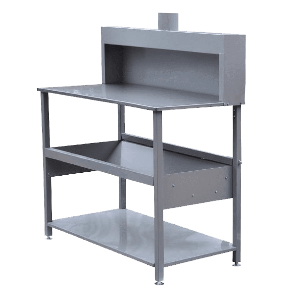 Stainless steel topped worktable, equipped with a hood that can be connected to the central air extraction system, providing effective removal of all harmful solvent fumes. An ideal working height is provided and the stainless steel top is very easy to clean. The shelf beneath the tabletop stores square tins in a tilted position for safe and convenient use of thinners and hardeners. A bottom shelf is provided for storing stock and adjustable feet ensure a level working platform.